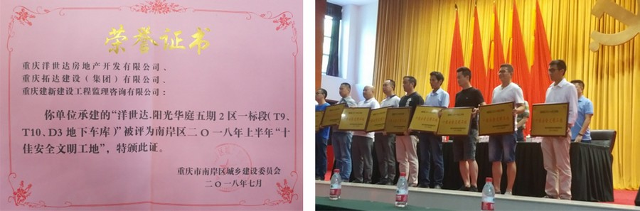 2018年7月17日,經(jīng)南岸區(qū)建委嚴(yán)格評選,洋世達(dá)·南濱特區(qū)(陽光華庭五期)二區(qū)一標(biāo)段項(xiàng)目(T9、T10、D3地下車庫)榮獲南岸區(qū)2018年度上半年“十佳安全文明工地”的榮譽(yù)稱號。