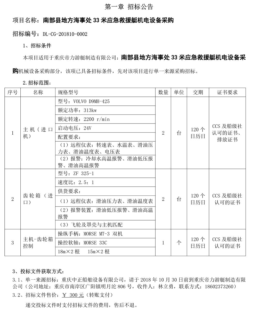 蓬安縣地方海事處33米應(yīng)急救援艇機(jī)電設(shè)備采購