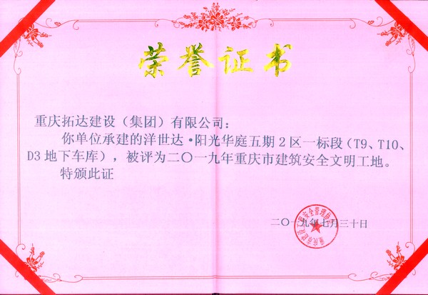 2019年7月,經重慶市建設工程安全管理協會嚴格甄選,洋世達?陽光華庭五期2區標段(T9、T10、D3地下車庫)項目榮獲“2019年度建筑安全文明工地”的稱號。