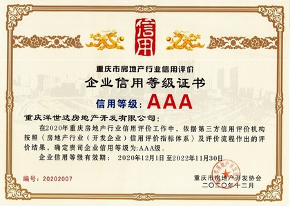 重慶洋世達房地產開發有限公司榮獲“重慶市房地產開發協會2020年度優秀會員單位”稱號和重慶市房地產行業信用評價信用等級AAA級證書。